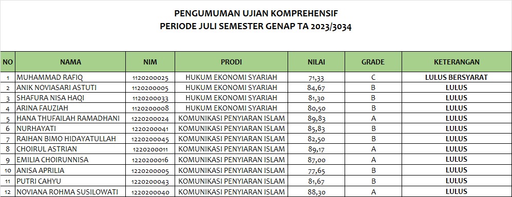 Pengumuman Ujian Komprehensif Periode 4-5 Juli Semester Genap TA 23/24 Tinggalkan Komentar / Berita Terbaru, Pengumuman / Oleh adminsitus Berikut Hasil Ujian Komprehensif Mahasiswa STAI Daarut Tauhiid Periode tanggal 04-05 Juli Semester Genap Tahun Ajaran 2023/2024