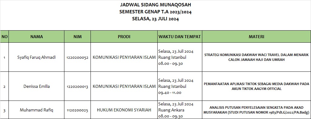 JADWAL SIDANG MUNAQOSAH PERIODE Bulan Juli TAHUN AKADEMIK 2023/2024