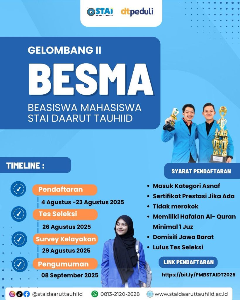 STAI Daarut Tauhiid bersama DT Peduli membuka kesempatan emas bagi para calon mahasiswa berprestasi untuk bergabung melalui program BESMA (Beasiswa Mahasiswa) Gelombang I.
